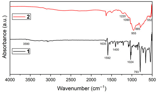 Complex 2 was comprehensively characterized using various instrumental techniques, including UV–vis spectroscopy, 1H NMR spectroscopy, elemental analysis, emission spectroscopy, Fourier-transform infrared (FTIR) spectroscopy, powder X-ray diffraction (PXRD), electrospray ionization mass spectrometry (ESI-MS), and thermogravimetric analysis. The 1H NMR spectrum of 2 in DMSO-d6 (dimethyl sulfoxide) is shown in Figure S1. A singlet at 9.57 ppm is assigned to the β-pyrrolic protons in 2. The protons associated with the pyridyl rings appear as doublets at 9.12 ppm (for 3,5 positions) and 9.41 ppm (for 2,6 positions). In the case of 1, these protons resonate at 9.12 ppm (s), 9.11 ppm (d), and 8.30 ppm (d) [72]. The spectra confirm that after complexation, the peak positions of these protons in 2 are downfield-shifted from those in 1 and have the same splitting patterns. The ESI mass spectrum of 2 is shown in Figure S2. The peak at m/z 233.67 (theoretical m/z of 233.52) corresponds to the molecular formula of [Sn(H2PO4)2TPyHP]4+. The peak at m/z 129.39 was designated as [Sn(OH2)2TPyHP]6+ (theoretical: 129.24). The experimental elemental (C, H, and N) data for 2 were in high agreement with the theoretical value.