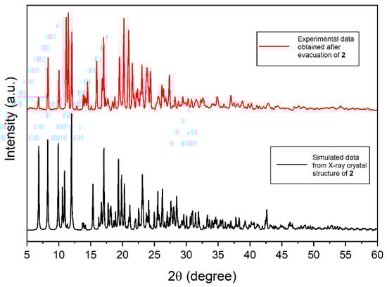 The crystal structure of 2 contains six water molecules in the lattice. These solvent molecules seem to be vulnerable and may be lost from complex 2. Therefore, the complex may lose its crystalline nature. To confirm the crystallinity of 2, as-synthesized complex 2 was heated at 90 °C for 8 h in vacuum. The measured PXRD pattern of 2 in the 2θ range of 5–60° is shown in Figure 7. For comparison, this pattern is contrasted with the simulated PXRD pattern of 2 derived from the X-ray single-crystal structure. Complex 2 maintained a highly crystalline nature with a primary match between the experimental and simulated, as indicated by the powder-XRD patterns of evacuated samples of 2 (Figure 7). Both PXRD patterns were almost similar in the number of peaks, position, and relative intensities. This demonstrates the high rigidity and robustness of the porphyrin-based framework in 2. The structure of the framework remains intact even after the eviction of the solvents.
