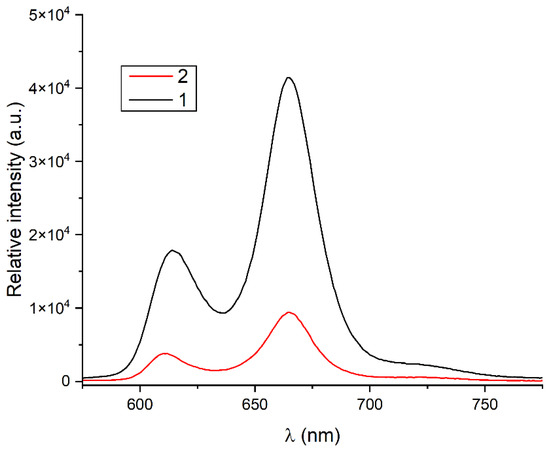 Fluorescence spectra of 1 and 2 in DMSO (λext = 550 nm; optical density = 0.3).