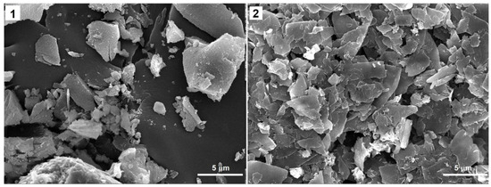 FE-SEM (field-emission scanning electron microscopy) images of both the compounds were observed to examine the morphologies as well as the self-assembly behaviors. To prepare the samples, both compounds were suspended in a 1:1 solvent mixture of water and acetone (C = 1.5 mM), followed by centrifugation at a speed of 13,500 rpm for 20 s, and then drop-casted on the surface of copper tapes. Then, the sample foil was dried in air. Pt coating was necessary before the FE-SEM studies. The images of the self-assembled nanoaggregates of 1 and 2 are given in Figure 10. It is clear from the FE-SEM images that the morphologies of 1 and 2 are significantly different. Compound 1 comprises nanostructures without specific dimensions. However, 2 exhibits a high-density nanoplate morphology with smooth surfaces. The ionic porphyrin-based nanoplates were irregularly shaped, where the average size and thickness of the smaller plates were 1200 × 600 nm and ≈50 nm, respectively. The average diameter of the bigger nanoplates differed from 3500 × 1500 nm, and their thickness was ≈50 nm.