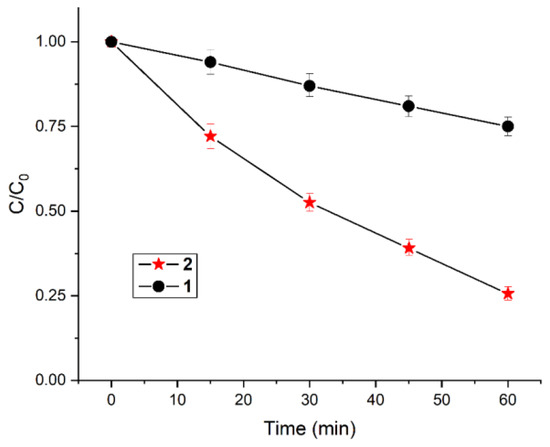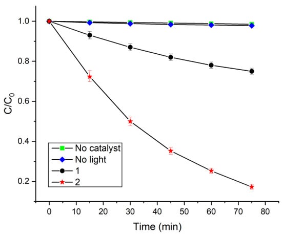 The photocatalytic activities of 1 and 2 were analyzed through the visible-light photodegradation of the aqueous solution of toxic contaminants. MO dye and TC were chosen as model contaminants for the catalytic degradation experiments. The time-dependent optical absorption spectra of MO dye in the presence of complex 2 are given in Figure S6. Without a visible light or catalyst, MO slightly decomposed (Figure 11). Therefore, catalysts as well as light are necessary for the photocatalytic photodegradation of MO dye. The photocatalytic degradation of MO was analyzed by determining the absorbance band at 462 nm with increasing irradiation time. The catalytic performances of both compounds in MO dye degradation were determined by calculating the decomposition efficiency, (C0 − C)/C0, where C0 is the initial concentration of MO dye and C is the concentration at time t. Figure 11 clearly shows that 2 is more efficient at photocatalytically degrading MO dye than 1, decomposing MO completely within 75 min. The photocatalytic photodegradation efficiencies of 2 and 1 reached 83% and 30%, respectively. The kinetics of MO dye decay were modeled using a pseudo-first-order rate equation, represented by ln(C0/C) = kt, which is generally employed for catalytic decomposition reactions if the initial concentration of the model pollutant is low. In the equation, k is the pseudo-first-order decay rate constant. The photodegradation rate of MO dye (Figure S7) was obtained from the plot of ln(C0/C) vs. t in Figure 11. The pseudo-first-order photodecomposition rate constant for MO by 2 (0.023 min−1) is ≈4.6 times better than that of 1 (0.005 min−1). These rate constants are more promising than those obtained by other catalysts used to degrade MO dye (Table 1).