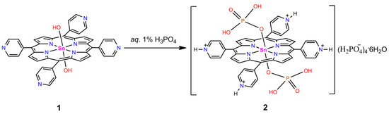 The reaction of Sn(OH)2TPyP (1) with H3PO4 in a mixture of water and acetone affords crystalline [Sn(H2PO4)2(TPyHP)](H2PO4)4∙6H2O (2) (Scheme 1). The Materials and Methods Section 3 contains every detail of the synthesis procedure of 2 from 1.