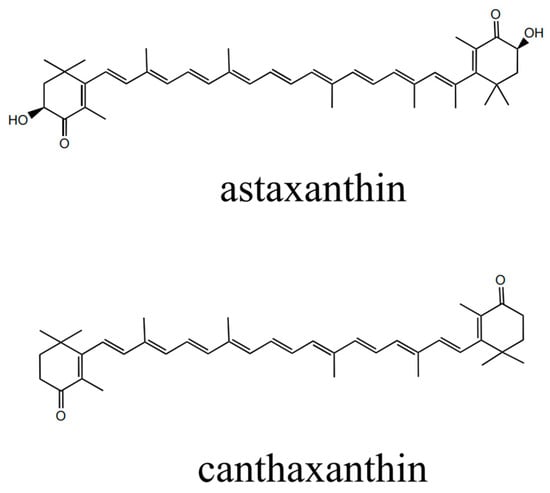 Astaxanthin, a ketone carotenoid, has the chemical formula 3,3′-dihydroxy-β,β′-carotene-4,4′-dione (Figure 1). Astaxanthin is soluble in lipids [1] and organic solvents, but insoluble in water [2]. The structural diagrams of astaxanthin and canthaxanthin can be found in Figure 1. Research has shown that astaxanthin has a range of biological activities, such as anticancer, antioxidant, antiaging, and antihypertensive effects [3]. Additionally, astaxanthin has been recognized for its coloring properties and potential to increase the reproductive rates of animals [4]. The antioxidant capacity of astaxanthin is notably superior to that of lutein by more than 2.8 times. Astaxanthin can also protect cell membranes 100 times more effectively than vitamins can. Furthermore, astaxanthin is 800 times more potent than coenzyme Q and 6000 times more effective than vitamin C in quenching singlet oxygen [4,5,6,7,8]. Consequently, astaxanthin has garnered significant attention from multiple industries and is extensively utilized in feed additives [9], health products [10], cosmetics [11], and pharmaceuticals [12].