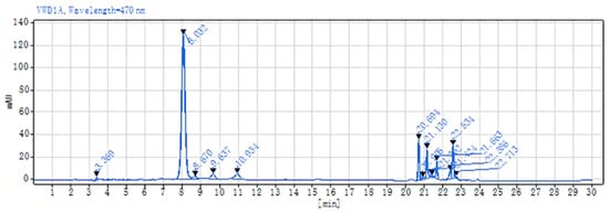 The astaxanthin content in the samples derived from seven distinct cell wall disruption methods was meticulously analyzed in accordance with the protocol detailed in Section 3.5.4, and the findings are presented in Table 1. The lactic acid method provided the most astaxanthin after the cell wall disruption, followed by the NaOH method at 40 °C for 2 h and the DMSO method. The chromatographic profile of the astaxanthin extracted via the lactic acid method is shown in Figure 2.