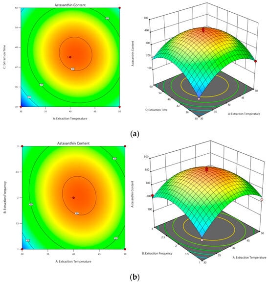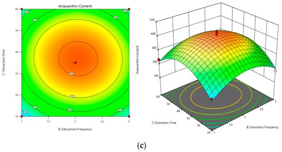 Three-dimensional contour plots and response surface maps. (a) Surface and contour plots of the effect of the interaction of extraction temperature and extraction time on astaxanthin content (AC). (b) Surface and contour plots of the effect of the interaction of extraction temperature and extraction frequency on astaxanthin content (AB). (c) Surface and contour plots of the effect of the interaction of extraction time and extraction frequency on astaxanthin content (BC).