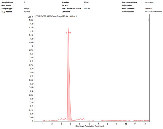 Astaxanthin was extracted via the optimal method described in Section 3.2 and subsequently characterized by UPLC-Q-TOF MS. The analytical results are shown graphically in Figure 4 and Figure 5. The [M+H]+ molecular ion peak at m/z 597.3943 corresponds to astaxanthin, which was confirmed to be the major bioactive constituent in the subcritical extraction sample.