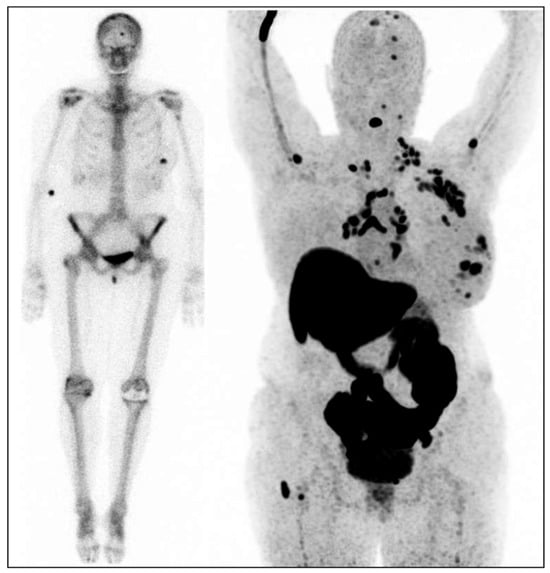 Female patient with the estrogen receptor (ER)-positive breast cancer in her left breast. Left image: bone scan for dissemination: uptake in the primary tumor in the left breast and uptake in the skull [13]. Right image: [18F]-FES-PET with multiple lesions in the left breast, multiple ER-positive lymph node metastases (axillae, clavicular regions, neck, mediastinum, and hili), and multiple ER-positive bone metastases (skull, spine, left humerus, and right femur).