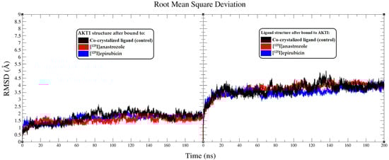 Analysis of root mean square deviation (RMSD) from the molecular dynamics (MD) simulations conducted over a 200 ns period. The left panel presents RMSD plots showing the molecular fluctuations in the AKT1 enzyme backbone when interacting with the co-crystallized ligand (black), [125I]anastrozole (red), and [125I]epirubicin (blue). The RMSD plots further illustrate the conformational shifts of the co-crystallized ligand (black), [125I]anastrozole (red), and [125I]epirubicin (blue) as they bind to the AKT1 enzyme.