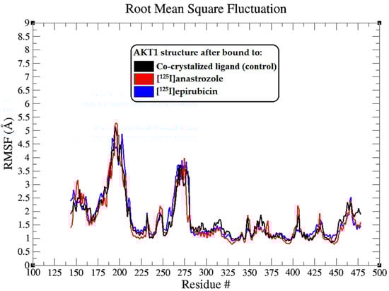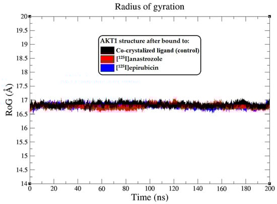 Radius of gyration (RoG) plots showing the AKT1 enzyme backbone atoms throughout the 200 ns MD simulation, illustrating the interactions with the co-crystallized ligand (black), [125I]anastrozole (red), and [125I]epirubicin (blue).