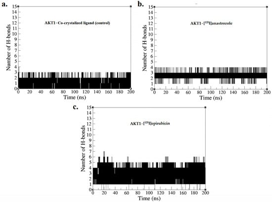 Hydrogen bond profiles obtained from the MD simulation over a time period of 0–200 ns for (a) AKT1-co-crystallized ligand, (b) AKT1-[125I]anastrozole, and (c) AKT1-[125I]epirubicin.