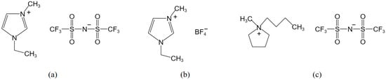 The molecular structure of the following ionic liquids are shown in Figure 1: 1-ethyl-3-methylimidazolium bis(trifluoromethanesulfonyl)imide salt (ILA), 1-ethyl-3-methylimidazolium tetrafluoroborate (ILB), and N-methyl,butylpyrrolidinium bis(trifluoromethanesulfonyl)imide salt (ILC), Shanghai Chengjie Chemistry Co., Ltd. (Shanghai, China), with 99% purity.