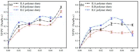 Figure 2 shows the changes in the YP/PV ratio of polymer slurries with different concentrations of ionic liquids at different aging temperatures. As can be seen from Figure 2, the YP/PV ratio basically increased with the increase in IL concentration at different aging temperatures, but the YP/PV ratio decreased greatly with the increase in temperature. The YP/PV ratio of the polymer matrix formulated with ILA is slightly higher than that of fluids with the same concentration of ILB, indicating that for ILs with the same imidazolium cation structure, the ILA with the bis(trifluoromethanesulfonyl)amide anion has a better ability to improve rheological properties of the polymer matrix than the ILB with the tetrafluoroboric anion. Previous studies have shown that the imidazolium cation of ILA improves the high-temperature rheological properties of water-based drilling fluids by the interlayer exchange of cationic ions with sodium montmorillonite []. This suggests that the rheological properties of polymer slurries are not only affected by the cationic structure of ILs but also by the anionic structure of ILs. ILA has six C-F bonds and exhibits hydrophobicity, and it is less water-soluble than ILB with tetrafluoroborate anions. But ILA has four S=O groups, which can form more hydrogen bonding with water molecules or montmorillonite in the matrix, resulting in a more stable spatial network structure between the clay particles, and at higher temperatures, the ILA may be more stable and have a better ability to improve the high-temperature rheological properties of the polymer matrix.