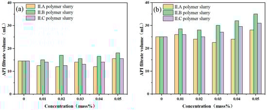 The filtration-loss characteristics of drilling fluids determine the ability to form mud cakes in the well wall, which directly affect the stability of the well wall. At high temperatures, the filtration-loss volume of drilling fluids increases significantly, and the penetration of drilling fluids into the formation, which leads to the hydration and expansion of clay minerals in the formation, results in the destabilization of the well wall. Polymer slurries containing different concentrations of ILA, ILB and ILC were prepared, and the API filtration loss was tested after aging at ultra-high temperatures. The experimental results are shown in Figure 5.