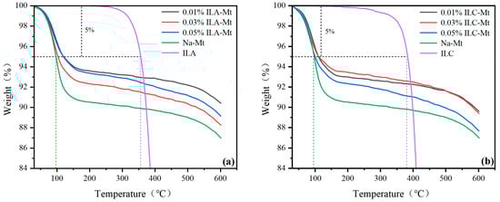 TGA curves of Na-Mt modified by different ILs: (a) ILA; (b) ILC.