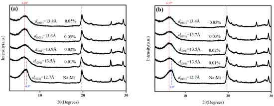 XRD plots of Na-Mt modified with different ILs: (a) ILA; (b) ILC.