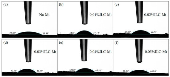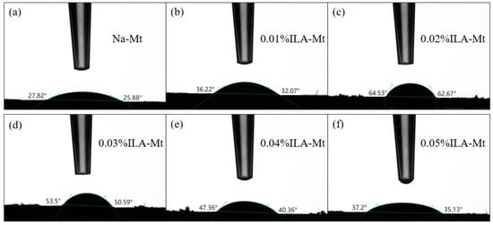Contact angle test of Na-Mt modified with different concentrations of ILC: (a) Na-Mt; (b) 0.01%ILC-Mt; (c) 0.02%ILC-Mt; (d) 0.03%ILC-Mt; (e) 0.04%ILC-Mt; (f) 0.05%ILC-Mt.