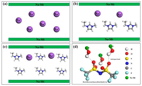 Schematic diagram of the mechanism of ionic liquid interaction with sodium montmorillonite: (a) layered Na-Mt; (b) monomolecular layer adsorption at lower concentrations; (c) bimolecular layer adsorption at higher concentrations; (d) hydrogen bonding between Na-Mt and the ionic liquid.
