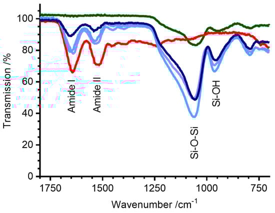 FTIR (powder) spectra of ensilicated lysozyme. Green—silica alone, red—untreated lyophilised lysozyme powder, light purple—ensilicated lysozyme (ensilication reaction in Tris-HCl buffer), light blue—ensilicated lysozyme (ensilication reaction in phosphate buffer), dark blue—ensilicated lysozyme (ensilication reaction in PBS). Amide I (C=O), Amide II (C-N), Si-O-Si, and Si-OH stretching bands are labelled.