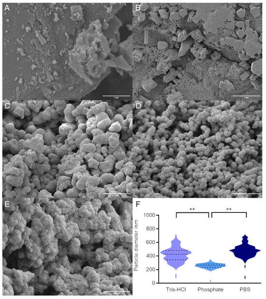 FE-SEM of ensilicated lysozyme samples. (A) Control reaction with silica alone (no protein, no buffer). (B) Control reaction with silica and PBS alone (no protein). (C) Lysozyme ensilicated in Tris buffer. (D) Lysozyme ensilicated in phosphate buffer. (E) Lysozyme ensilicated in PBS. Scale bar in each panel is 1 μm. (F) Quantification of particle diameters for ensilicated protein (100 particles). Dashed line shows mean and dotted lines show upper and lower quartiles. ** indicates significant difference (p < 0.01) in mean values, as determined by Tukey test.