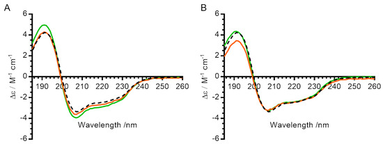 Effect of ensilication and heat treatment on secondary structure of lysozyme. (A) Circular dichroism spectra for lysozyme ensilicated in phosphate buffer. (B) Circular dichroism spectra for lysozyme ensilicated in PBS. All measurements were made in 10 mM phosphate pH 7. Black dashed line—control (untreated) lysozyme. Green—lysozyme after ensilication and desilication alone. Orange—lysozyme after ensilication, heat treatment for 1 h at 100 °C in oven, and desilication.