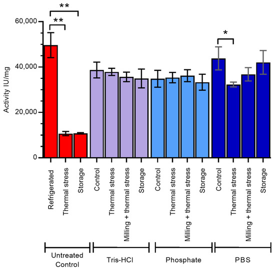 Enzyme activity of lysozyme after desilication from ensilication. The effect of long-term storage (18 months) at room temperature, thermal stress (1 h in oven at 100 °C), or milling and thermal stress combined while ensilicated, compared with control (ensilicated lysozyme dried overnight at room temperature), was determined. Untreated control samples are dry lyophilised lysozyme powder treated as described. Red—untreated control, purple—samples ensilicated in Tris-HCl, light blue—samples ensilicated in phosphate buffer, dark blue—samples ensilicated in PBS. Error bars indicate standard deviation of three measurements. * indicates significant difference (p < 0.05) in mean values and ** indicates significant difference (p < 0.01) in mean values, as determined by Tukey test.