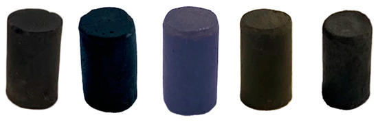 Composites LOSx@T (where x = wt. % sulfur, varying from 80 to 90, and T represents the reaction temperature in °C) were prepared by heating lignin oil (10, 15, or 20 wt. %) and sulfur (90, 85, or 80 wt. %) to the requisite temperature in a sealed vessel for 2 h. The composites LOS80@230 and LOS85@230, and LOS90@230 [108] were prepared in thick-walled glass pressure vessels slowly heated to 230 °C and then held at 230 °C for 2 h. Composites LOS90@250 and LOS90@300 were prepared in a stainless steel autoclave reactor The composites were mechanically stirred and slowly heated to either 250 °C or 300 °C, respectively, and held at that temperature for 2 h. After cooling to room temperature, all the materials solidified into a dark brown, remeltable solid. After melting, the composite material was transferred into molds for shaping and cooled to room temperature (Figure 2 and Figure 3).