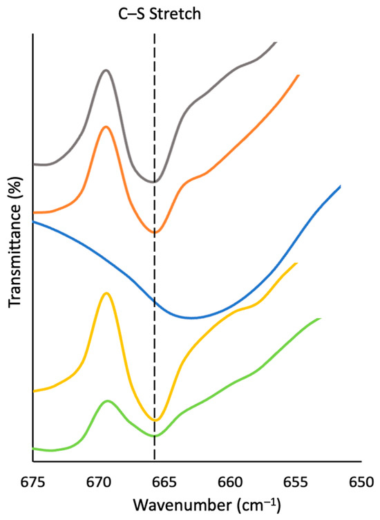 Portion of the FT-IR spectrum revealing the S–C stretch for LOS80@230 (grey trace), LOS85@230 (orange trace), LOS90@230 (blue trace), LOS90@250 (yellow trace), and LOS90@300 (green trace). The entire set of IR spectra are presented in the Supplementary Materials file.