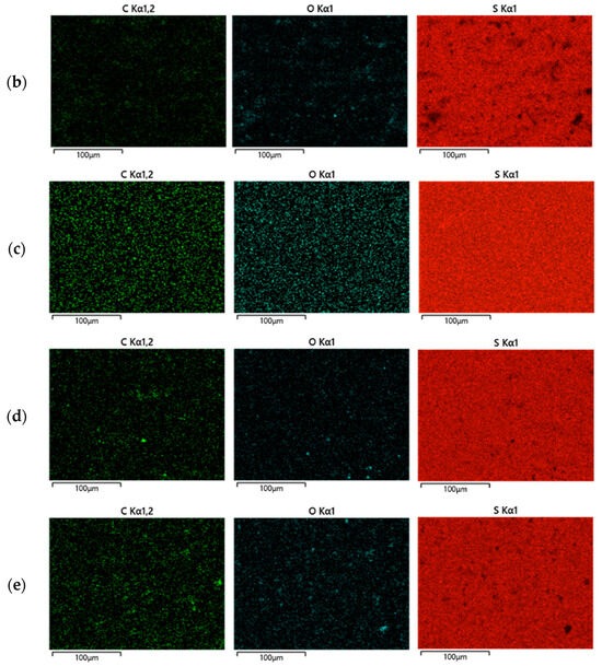 Elemental mapping of the elements carbon (green, left), oxygen (blue, middle), and sulfur (red, right) in (a) LOS80@230, (b) LOS85@230, (c) LOS90@230, (d) LOS90@250, and (e) LOS90@300 by energy-dispersive X-ray analysis (EDX).