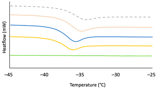 The analysis of LOSx@T composites by differential scanning calorimetry (DSC) (Figures S13–S27, Supplementary Materials) showed thermal transitions that were concomitant with the presence of polymeric sulfur and cyclo-S8. LOS90@230, LOS90@250, and LOS90@300 exhibited the melting peaks (114 °C, 117 °C, and 119 °C) expected for cyclo-S8. However, LOS85@230 and LOS80@230 exhibited lower melting peaks at 106 °C and 105 °C, indicating an α-to-β transition of sulfur. A glass transition temperature (Tg) was also witnessed (Figure 10) at −35 °C or −36 °C for all composites other than LOS90@300, diagnostic for polymeric sulfur [117,118,119]. Similar to the previously studied LS90–99 composites, LOS90@300 did not exhibit a glass transition temperature. This is likely due to the higher temperature allowing for more crosslinking, leading to shorter sulfur chains.