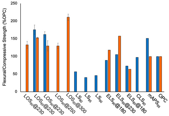 Graphical representation comparing the flexural strength (blue bars) and compressive strength (orange bars) of LOSx@T composites with lignin–sulfur composites (LSx), lignin/cellulose-containing sulfur composites (ELSx@T, CLS80, mAPS95), and ordinary Portland cement (OPC). Bars not displayed signify that the attendant value was not previously reported for the listed material or could not be obtained for the current research.