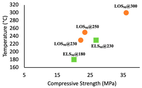 The LOSx@T composites studied herein must meet the specified mechanical strength requirements to be considered as potential replacements for less sustainable materials. For example, OPC requires a compressive strength greater than 17 MPa and a flexural strength greater than 3 MPa. The compressive strength of the LOSx@T composites reported exceeded that required of OPC with strengths ranging from 22.1 to 35.9 MPa. Other lignin-containing HSMs have been reported and compared to the LOSx@T composites. The composites ELSx@T (where x = wt. % sulfur in the reaction mixture and T represents the reaction temperature in °C), for example, were prepared by reacting sulfur with oleic-esterified lignin. ELS80@180 has a notably lower compressive strength (10.9 MPa) than LOSx@T composites. ELS80@180 comprises twice the amount of organic component as LOS90, LOS90@250, and LOS90@300. ELS80@180 was also reacted at a much lower temperature in comparison to LOSx@T composites, whose reaction temperatures ranged from 230 to 300 °C. A larger amount of organic material and lower reaction temperature possibly contributes to a lower sulfur rank, resulting in a lower compressive strength. The ELS90@180 and ELS90@230 composites exhibited similar compressive strengths as the LOS90@230, LOS85@230, LOS80@230, and LOS90@250 composites. The LOS90@300 exhibited a much higher compressive strength (35.9 MPa) than all other composites reported in Table 3 and compared graphically in Figure 12 (stress–strain plots are presented in Figures S28–S32, Supplementary Materials). This can possibly be attributed to the higher reaction temperature of 300 °C, which can lead to a higher sulfur rank and a higher compressive strength [65]. While there was not a clear trend displaying how an increase in organic material affects the compressive strength, an increase in compressive strength is observed as the reaction temperature is increased (Figure 13). The preparation of the oleic-esterified lignin (the precursor for ELSx@T) is a much more time- and energy-intensive process compared to the process for preparing the lignin oil required for preparing LOSx@T composites. Therefore, preparing lignin-oil-containing HSMs is a more realistic concept for acquiring comparable compressive strength features.