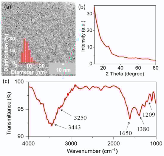 The morphology and size of the CDs were characterized by TEM, as shown in Figure 2a. They were nearly spherical carbon nanoparticles, approximately 7.5 nm in diameter with a narrow size distribution. The XRD profile of the CDs exhibited a peak at 25°, which corresponded to the crystal lattice distance of (002); this is a key feature of materials based on carbon (Figure 2b) [42,43]. Fourier transform infrared (FT-IR) analysis was carried out to probe the surface functional groups on a CD particle (Figure 2c). The peaks located at around 3443 and 3250 cm−1 could belong to the stretching frequencies of O–H and N–H. The sharp peak at 1650 cm−1 corresponded to the stretching vibration peak of the C=O bond, while those peaks around 1380 and 1209 cm−1 were attributed to C–N and C–O, respectively. These results verify that both the amine and carboxy groups exist on the particle surface of CDs as functional groups, which provides a possibility for further application research on CDs. The zeta potential of the CDs was estimated to be −6.5 mV, revealing that negatively charged groups are the majority.