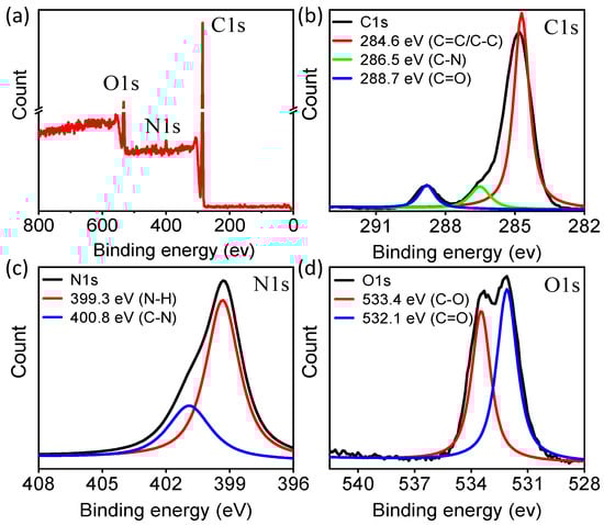 XPS spectra of DBP-CDs. (a) Survey profile, (b) C1s, (c) N1s, and (d) O1s.