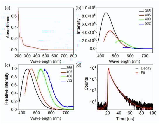 UV–visible absorption spectroscopy was performed to investigate the photophysical properties of CDs (Figure 4a). The UV–vis spectrum of CDs exhibited wide optical absorption, ranging from 200 to 700 nm, with two exciton peaks observed at approximately 237 nm and 350 nm. The first peak at 237 nm indicates π–π* transition of C=C, and the second exciton peak around 350 nm is attributable to an n-π* transition of C=O. This suggests the condensation of the molecular precursors and the formation of CDs. To explore the fluorescence properties of CDs in detail, different excitation wavelengths were investigated (Figure 4b,c). The highest emission at 439 nm was observed using an excitation wavelength of 365 nm. Further, the quantum yield (QY) of the CDs was computed to be 28.2%, using quinine sulfate as a reference (ex = 370 nm, QY = 54%) [1]. The maximum emissions of 463 nm, 527 nm, and 554 nm were observed at excitation wavelengths of 405 nm, 488 nm, and 532 nm, indicating a distinct excitation-dependent feature of CDs. As previously reported, the blue fluorescence excited by UV light arises from molecular fluorophores, while the excitation-dependent fluorescence at the excitation wavelengths of >400 nm is attributable to surface states. Although the absorbance from surface states is relatively weak in the visible spectrum, they are beneficial for bioimaging due to the emission of long wavelength fluorescence. The fluorescence lifetime measurement of the CDs presents a multi-exponential fluorescence decay curve with an average lifetime of 3.7 ns.