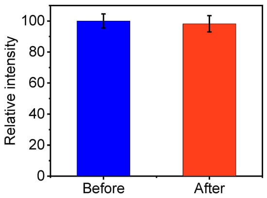 One of the key components in determining the optical characteristics of fluorescent probes is photostability. Therefore, the fluorescence fluctuation of the CDs was observed both before and after they were exposed to a 365 nm UV lamp. As shown in Figure 5, almost no obvious fluctuation in fluorescence intensity was observed from non-irradiation to irradiation within 40 min. This result implies the excellent photostability of the synthetic CDs.