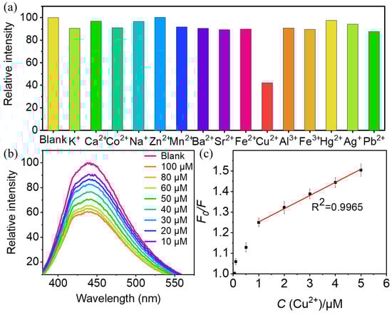 (a) Fluorescence responses of CDs in the presence of different metal ions; (b) fluorescence emission spectra of CDs with different concentrations of Cu2+ (from 10 µM to 100 µM); (c) linear relationship between F0/F and Cu2+ concentration within the concentration range of 0–9 µM.
