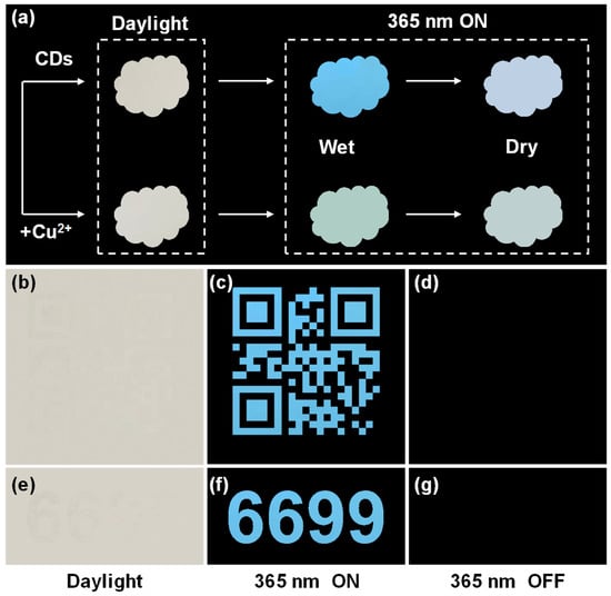 Benefiting from their great photostability and excellent fluorescent properties, synthetic CD dispersion can potentially be employed as an encrypted security ink in anti-counterfeiting and information encryption fields. Fluorescent printing has garnered significant research interest due to its simple operation and effortless verification, distinguishing it from commercial anti-counterfeiting mechanisms such as laser holographic response, temperature response, and magnetic response. Currently, fluorescent inks primarily rely on organic dyes, semiconductor QDs, and rare earth materials for their formulation [51,52]. Nevertheless, the high cost, limited biocompatibility, and potential environmental risks associated with these materials may restrict their utilization. Thus, CDs are regarded as a promising new material for information encryption and anti-counterfeiting. As a proof-of-concept application, samples of various patterns were easily prepared (Figure 7), with a cloud-shaped tag, QR code, and Arabic numbers included. The cloud-shaped tag is pale yellow in daylight and emits bright blue fluorescence under the irradiation of 365 nm UV light (Figure 7a). Even when the tag is dried, it can still emit a slight blue fluorescence. However, once the copper ion solution had been dropped onto a cloud-shaped paper substrate that had been soaked in CD ink, the bright blue fluorescence quickly disappeared and glowed light green. After the paper substrate had dried, the light green color almost disappeared. These phenomena not only indicate that the CDs have a potential application in anti-counterfeiting, but also that they exhibit high sensitivity to copper ions. Similarly, the QR code (Figure 7b) and the “6699” number (Figure 7e) are completely invisible to the naked eyes under natural daylight, while bright blue fluorescent patterns can be observed under the 365 nm UV light (Figure 7c,f) and disappear once the lights is turned off (Figure 7d,g). Thus, it follows that the sample patterns can be designed flexibly, and they can exhibit high covertness under natural daylight. They can emit bright blue fluorescence when subjected to 365 nm UV, even if the sample is sophisticated and imperceptible. These results certify that these CDs have potential uses in high-level anti-counterfeiting fields to identify the authenticity of valuable items (e.g., tickets, merchandise tags, and coupons), as well as in security fields for protecting important information (e.g., sensitive messages, passwords, and documents).