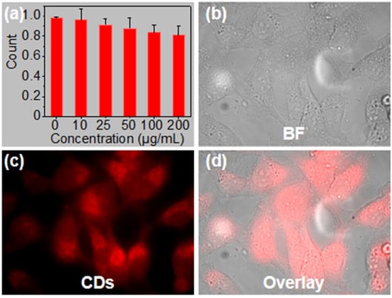 Cytotoxicity and bioimaging of CDs against HeLa cells. (a) Cell viability of CDs assessed by using MTT assays. Confocal fluorescence images of HeLa cells incubated with CDs: (b) bright field, (c) fluorescent channel, (d) merging of (b,c).