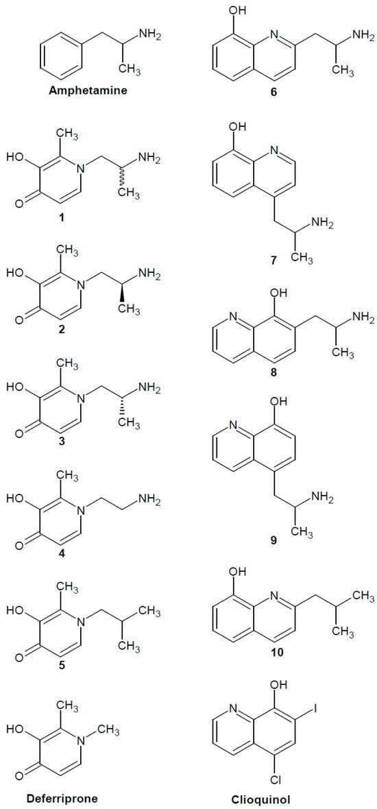 Iron chelation therapy has been proposed to reduce dopaminergic neurodegeneration [2,5,9] by preferentially binding to iron [10]. Deferiprone and clioquinol (Figure 1) have been investigated extensively in this regard [2,5,10,11,12,13,14,15]. They have high selectivities toward transition metals, are orally active, and can cross the blood-brain barrier [11,16,17]. There is, however, concern that the removal of iron from regions of the brain may produce adverse side effects, as iron is essential to normal brain function [12,18]. To gain further understanding of these complex processes, it would be beneficial to target the region of the brain where dopaminergic neurons are most abundant. Amphetamine-type compounds can fulfil this role. Amphetamine-like compounds can enter presynaptic neurons through dopamine transporter (DAT) proteins and compete for reuptake with dopamine. DAT is selectively expressed in dopaminergic cells, and given that the substantia nigra is rich in these cells, it is plausible that an amphetamine-like compound with the capacity to bind iron(III) might target and transport it from these areas. Recently, deferiprone-like molecules were synthesized that contain alanine groups (thus resembling L-DOPA), exhibited good iron(III) chelating ability and were protective to neuronal cells [19]. Brain-permeable compounds based on 8-hydroxyquinoline have also shown excellent neuroprotective effects [20,21,22].