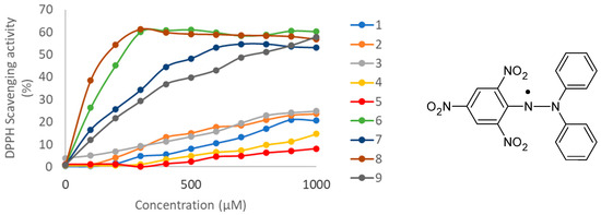 Left: DPPH scavenging activity of compounds 1–9 using ascorbic acid as reference material. Right: Structure of the stable radical 1-diphenyl-2-picrylhydrazyl (DPPH).
