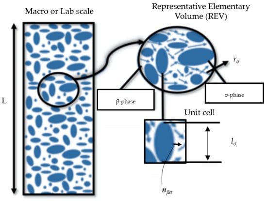 A brief description of VAM as applied to our problem [41] is presented here for the benefit of any uninitiated reader. In VAM, the averaging is performed over the representative elementary volume (REV) shown in Figure 1. A phase average operator () and an intrinsic phase average operator () are employed for upscaling, to evaluate the average value of any variable within the entire REV or within the β-phase of the REV, respectively. Their mathematical definitions [34] are given as follows: