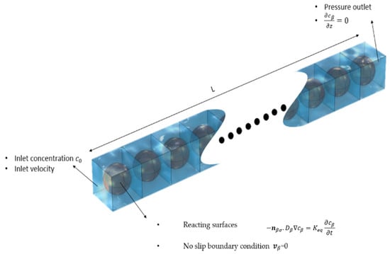 The packed columns with irregular solid-phase-adsorbing contaminant from water were represented in the simulation domain. The column was defined as a parallelepiped domain representing the macroscopic flow domain (i.e., the filter). It consists of a series of cubical domains linked in a daisy-chain manner. This is carried out so that the flow, species-concentration, and pressure boundary conditions at the outlet of one cubical domain are the same boundary conditions at the inlet of the down-stream cubical domain.