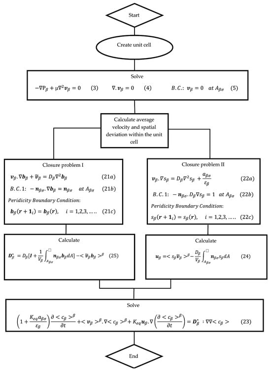 Figure 3 provides a flowchart for the VAM simulation process. It clearly presents the sequence of steps or stages involved in the VAM simulation. The first box involves solving for the Stokes flow inside a unit cell made from the microstructure of the porous filter under consideration. This allows one to determine field within the unit cell as well as obtain the z direction average velocity . The second box describes the equations used to solve the closure variables and within the same unit cell. Once these closure variables are integrated within the unit cell to obtain and .