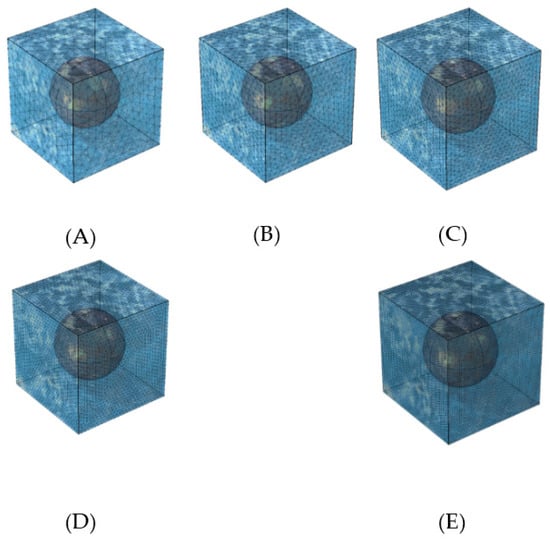 The effect of size of mesh elements in the unit cell numerical simulation is studied by utilizing five distinct levels of mesh refinement, categorized as: (A) coarse, (B) normal, (C) fine, (D) finer, and (E) extra fine. Especially, the anticipated areas with pronounced variable change and steep gradients received particular attention, with smaller element sizes assigned to such areas, in order to improve the accuracy of the model. The range of mesh densities applied in the simulations is illustrated in Figure 5.