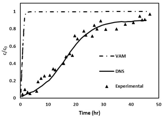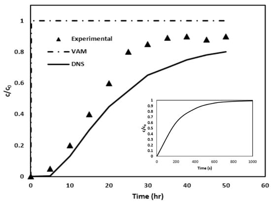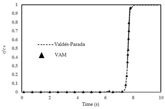 The graph presented in Figure 6 illustrates the validation of the current volume-averaging method (VAM) against the results obtained by Valdés-Parada [51]. The comparison is made through a BTC. The dashed line represents the findings of Valdés-Parada [51], while the triangular data points denote the outcomes from our VAM approach. From the graph, it can be observed that there is a sharp increase in normalized concentration from 0 to 1 after 7 s; this point of upsurge seems to be caused by a failure of the filtration process so that all of the contaminant is now able to pass through. The concentration then remains relatively stable at unity after the 8 s mark. Our VAM results closely follow the trend shown by Valdés-Parada’s data [51], demonstrating good agreement, particularly in the rapid increase and the subsequent plateauing. The agreement between the two studies suggests that the numerical implementation of VAM is accurate in the present study. This validation process is crucial for establishing the reliability of our VAM execution in capturing species transport in any column test, and it shows the potential applicability of the method for predictive modeling in similar scenarios. Further analysis, involving varying real time flow conditions or different chemical species, would be beneficial in confirming the versatility and accuracy of the volume-averaging method in the context of reactive transport in porous media.