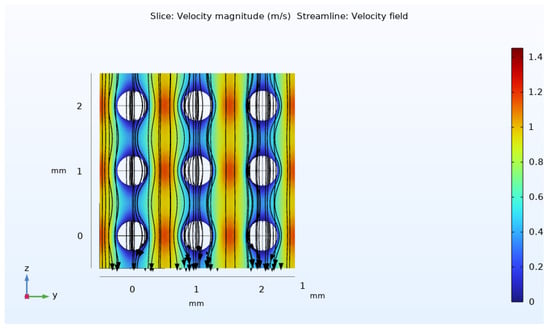 On the other hand, for DNS simulation, a daisy-chain of BCC-type unit cells, containing 133 unit cells, is created in COMSOL Multiphysics representing the porous medium (Figure 2). The sphere diameter is considered as 0.72 mm, and the porosity of unit cell is 0.52. After testing the different mesh sizes and selecting the average velocity as the criteria, the finer mesh size is selected as the optimum mesh type for the DNS simulation. Finally, as shown in Figure 2, Equations (1)–(5) are solved over the porous medium.