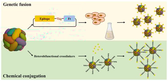 Diagram illustrating how antigens can be individually attached to ferritin subunits through genetic fusion or chemical conjugation. The antigens attached to ferritin subunits through two methods, the genetic fusion and chemical conjugation. In the process of genetic fusion, the gene encoding the antigen epitope was fused to the Ft gene using standard genetic engineering methods. The Ft fusion protein was expressed as an insoluble protein in Escherichia coli or mammalian cell overexpression system. During the chemical conjugation process, the Ft was functionalized by the crosslinker at first; furthermore, the antigen was coupled to the crosslinker construct.