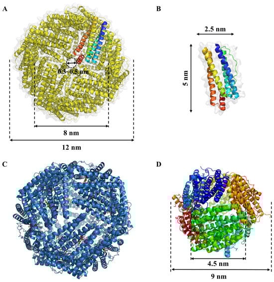 The classical ferritin, known as Ftn, encompasses a total of 24 subunits, boasting an external diameter of approximately 12 nm and an internal diameter measuring 8 nm (Figure 2A). It assumes an intricately symmetrical, hollow, globular configuration with a relative molecular mass ranging from 450 to 480 kDa. Each of these subunits takes on a cylindrical form, spanning 5 nm in length and 2.5 nm in width, characterized by the presence of 5 to 6 α-helices (Figure 2B) [14]. Natural ferritin is endowed with iron nuclei, primarily composed of 5Fe2O3·9H2O. Within the central cavity of each ferritin molecule, an impressive capacity to harbor roughly 4500 iron atoms is observed. In contrast, ferritin devoid of iron nuclei is referred to as apoferritin [9]. The inner surface of Ftn’s globular structure abounds in acidic residues, notably glutamate and aspartic acid, contributing to an isoelectric point falling within the range of 5.0 to 6.0. This property engenders a pronounced density of negative charges on the inner surface of the ferritin molecule [15]. It has been elucidated that the 24 subunits constituting ferritin form a positively charged octahedral framework. The interconnections between these subunits give rise to a specific array of channels. Each Ftn molecule is endowed with eight 3-fold channels and six 4-fold channels, featuring a pore size spanning from 0.3 to 0.5 nm (Figure 2A). These channels, in conjunction with the interior of ferritin, are characterized by a net negative charge. This distinctive attribute facilitates the diffusion of metal ions and positively charged small organic molecules into the interior cavity [16,17].