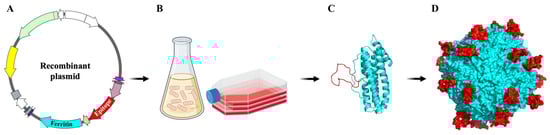 Schematic representation of ferritin-based self-assembling nanoparticles. (A) Recombinant plasmid of ferritin-based vaccine. The gene of ferritin was shown in light blue color and the antigen gene was shown in red color. (B) The recombinant plasmid was expressed with the common gene expression system. (C,D) Ferritin subunits spontaneously assemble into spherical structures, and additional antigens are expressed and integrated on the outer surface of ferritin during ferritin assembly.