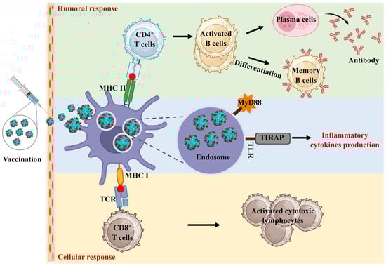 Additionally, the ordered distribution of antigens on ferritin nanoparticle surfaces facilitates multivalent binding of B cell receptors, thereby enhancing interactions with cognate B cells [71]. A nanoparticle-carried antigen differs from a monomeric, soluble antigen in terms of its pharmacokinetics. In contrast to antigen clusters, which diffuse into body fluids and undergo dilution upon administration, nanoparticles enable the maintenance of antigen clusters. Nanoparticles smaller than 20 nm have a longer time to circulate [72]. Furthermore, nanoparticles can enhance the transport of antigens to LNs, increase antigen uptake by LN-resident DCs, and stimulate immune responses by T and B cells [69]. Moreover, nanoparticle-based vaccines have the advantage of being retained at the injection site, enhancing DC uptake and presentation of antigens [68].